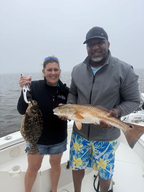 Kayla and Brandon came on board today and had a great morning under dense fog! Doubled up on a 21 inch flounder and a 29 inch red to add some solid fish to the box! What a fun day with wonderful people! I can’t wait to fish with them again. I’ve got plenty of openings available! Hit me up to get on the water!